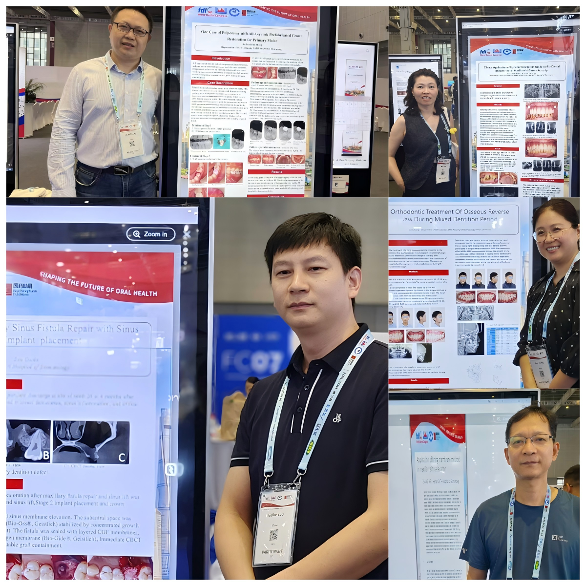 主任医师康娟《Application of Dynamic Navigation In Implantation With Atrophy Maxilla》(动态导航系统在上颌重度骨萎缩种植术中的临床应用)、副主任医师滕海英《Combined Occlusal Therapy For Odontogenic Sinusitis: Case Report》(调𬌗合𬌗垫治疗牙源性上颌窦炎1例)、副主任医师邹桂克《Simultaneous Maxillary Sinus Fistula Repair With Sinus Lift And Implant》(上颌窦瘘修补同期提升植骨种植修复1例)、副主任医师张继伦《Pulpotomy With All-Ceramic Prefabricated Crown Restoration For Primary Molar》(活髓保存联合全瓷预成冠修复治疗乳牙牙髓炎1例)、主治医师张炜《Application Of Lining Membrane Method In Maxillary Sinus Elevation》(衬膜法在上颌窦提升术中的应用)、主治医师张静《Orthodontic Treatment of Osseous Reverse Jaw During Mixed Dentition Period》(骨性反颌正畸矫治病例报告)等6篇做了全英文壁报展示交流。