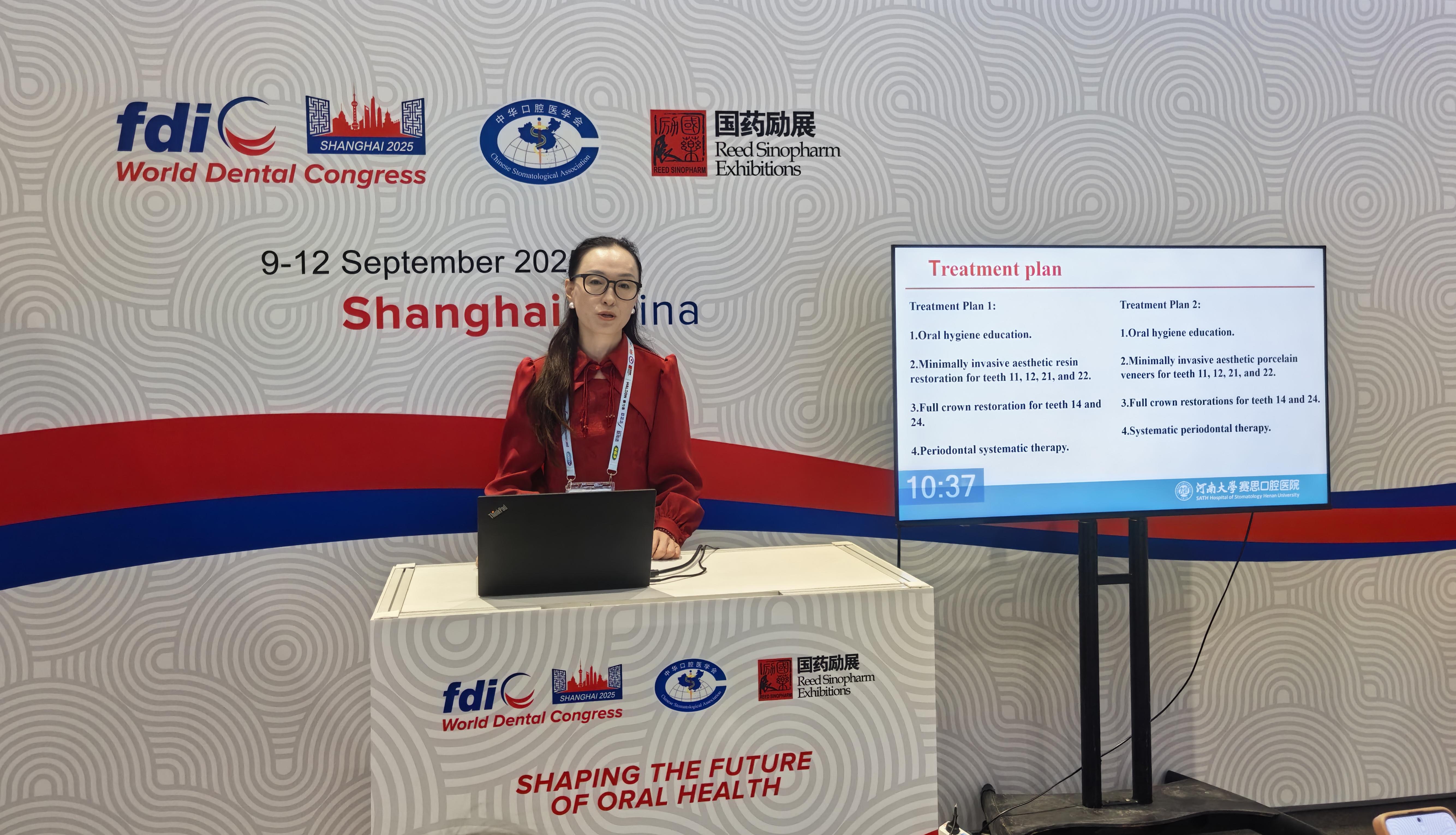 我院向此次大会投稿23篇,《The Effect Of Intensive Fiber Splint In Fixing Loose Teeth 》(高强度纤维夹板松牙固定效果)、《Analgesic Effect Of A Lidocaine Gel In Ultrasonic Supragingival Scaling》(复方甘菊利多卡因凝胶在超声波龈上洁治术中镇痛效果的临床研究)等14篇被录用。其中,副主任医师樊文和林玉芝分别以《Treatment of A Patient With Dental Phobia :A Case Report》(牙科恐惧症患者临床诊疗1例)、《Aesthetic Restoration To Control Anterior Black Triangle Using Bioclear》(前牙黑三角美学修复)为题,在各自专业分会场做全英文现场口头汇报交流。